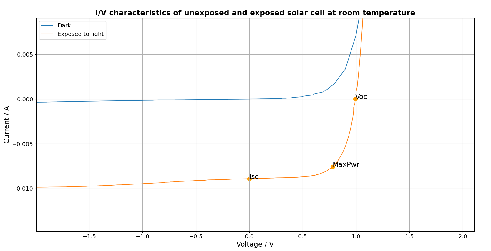 When the solar cell is exposed to light in a reverse bias condition, the photocurrent becomes the dominant current source. The offset created by the photocurrent pushes the I-V characteristic of the cell into the fourth quadrant, meaning that for positive voltages, the current sign is negative, thus the solar cell is producing power. Three characteristic points for an exposed solar cell are: short circuit current \(I_{SC}\), open circuit voltage \(V_{OC}\) and the point where the cell produces maximal power. The position of these three points depends on environmental (light intensity, temperature) and technological parameters (material of the cell, structure, dimensions, etc.) \begin{align} I_{SC} &= -0.00890048~\mathrm{A}\\ V_{OC} &= 0.991938~\mathrm{V}\\ P_{max} &= -0.0058848289158200005~\mathrm{W~(at~}V = 0.779302~\mathrm{V)} \end{align}