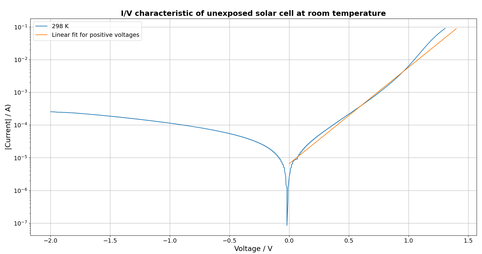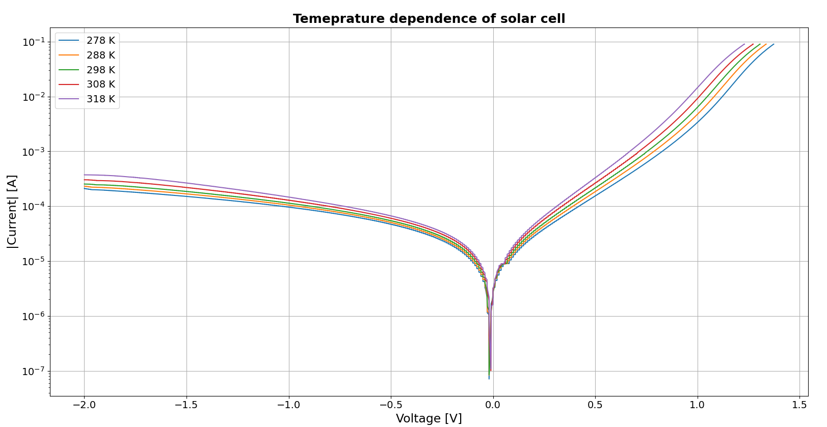 In reverse bias condition, there is a very strong current increase, which is dissimilar to the characteristic of a regular diode and deviates from the Shockley Equation by a factor of 100. The literature suggests that this might occur due to combined effect of two currents, where either one can be dominant: \(I_R\) – reverse leakage current and \(I_{Sh}\) - shunt resistance current. Leakage current under reverse bias includes the contributions of diffusion current, space charge generation current; band-to-band tunneling current and thermionic emission current. The shunt resistances are processed-induced, caused by grown-in defects of the material.