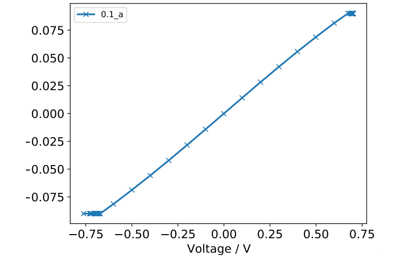 The tungsten carbide needle itself forms a thin oxide layer which leads to bad conductivity of the tip. To get rid of this oxide layer, scratching the needle onto the surface was not sufficient. Increasing the voltage between the two tips when connecting them together, however revealed a significant drop in resistance. Therefore, it was suspected that the oxide layer gets destroyed after a certain current is reached and as a consequence, of that, a temperature was reached, which destroyed this thin oxide layer.