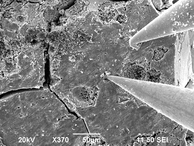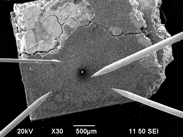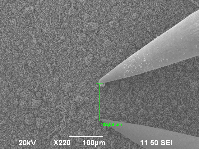 The bubble-like surface is due to oxidation of the copper probe. The scanning electron microscope has four very sharp tungsten carbide tips. These are used to hold certain probes down. Furthermore, they are electrically conducting and show a very low ohmic resistance of 4 $\Omega$ and therefore, they can be used to make 2-point and 4-point resistance measurements.