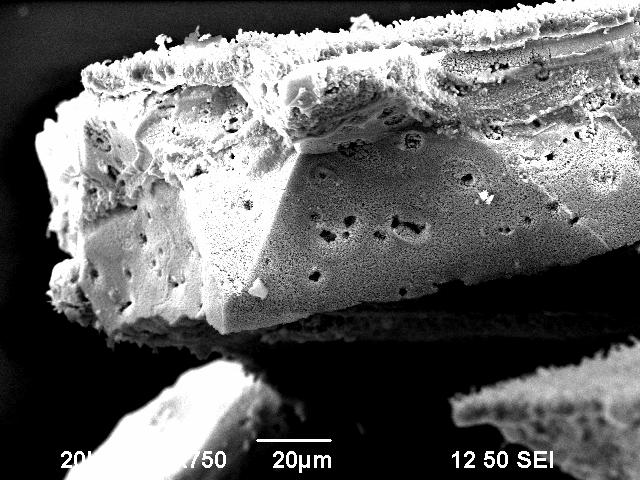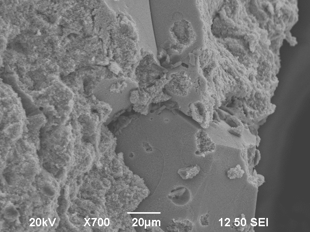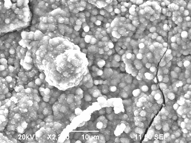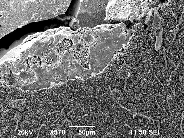Using a scanning electron microscope, a more detailed observation of the surface could be made. Two different kinds of surfaces were visible using the equipment’s focused electron beam. On the one hand, there were small round structures, but on the other hand a very smooth surface was visible.