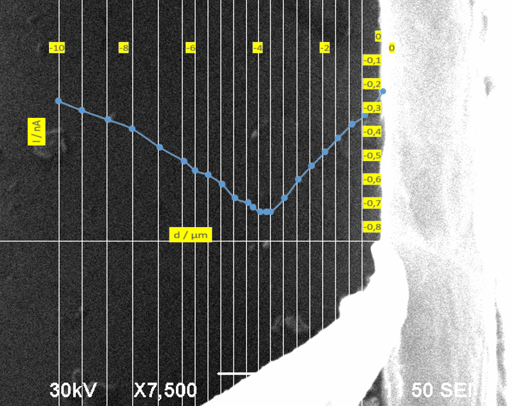 In order to check the position of the depletion zone in a more accurate manner, another method was suggested, which uses a focused electron beam. When the electron beam hits the surface, it creates electron-hole pairs in the material. If this is done inside the depletion zone, the holes and electrons can be separated via the built-in electric field. The idea now is to connect the p-doped and n-doped area electrically via a current measuring unit (there was used: Stanford research systems SR570 - low noise current amplifier). This adds a path where the separated electrons and holes can move and so the current gives us a measure for the number of separated electron-hole pairs. The depletion zone is very successful at separating electron-hole pairs and hence, there is obtained a big current when the electron beam is focused on the depletion zone. If the beam is applied on a metal or doped undepleted material, most of the separated electrons and holes recombine again and give no additional current. Therefore, the measured current is mainly the beam current.