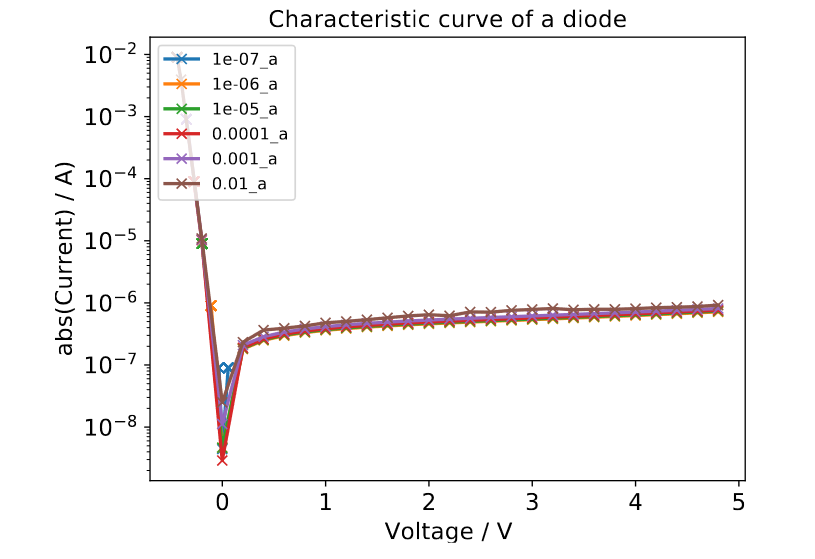The tips were placed close to the sample, the lid was closed and the pumps activated. It is important to know the cables are correctly plugged in. Therefore, a quick measurement of the diode V-I curve was made beforehand to find forward and reverse direction of the diode. The measurements are performed with a sourcemeter unit (SMU). Keithley 2600 Series Sourcemeter. Afterwards, the Python program was used to make a measurement with different currents. It yielded the following result: