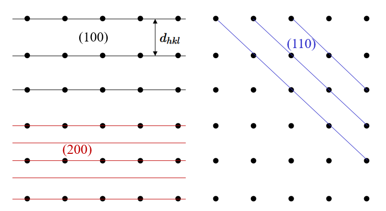 $$d_{hkl}= \frac{2\pi}{|\vec{G}_{hkl}|}.$$Below are some Bravais lattice points with a few netplanes drawn in.