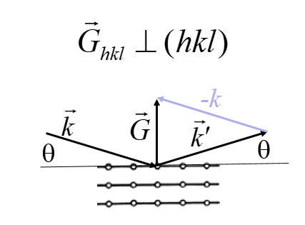 The script first calculates the primitive reciprocal lattice vectors from the primitive lattice vectors in real space. Then for each reciprocal lattice vector $\vec{G} = h\vec{b}_1+k\vec{b}_2+l\vec{b}_3$, the structure factor $n_{\vec{G}}$ is calculated. All reciprocal lattice vectors with the same absolute value diffract x-rays at the same angle. In the table below, $N$ is the number of reciprocal lattice vectors that have contribute to the diffraction signal for a certain angle θ. $d_{hkl} = 2\pi/|\vec{G}_{hkl}|$ is the distance between the $hkl$ netplanes.