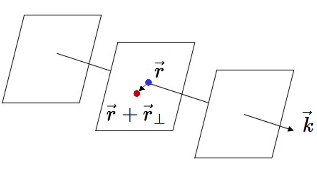 $$\exp \left(i\vec{G}\cdot\vec{r}\right)= \exp \left(i(G_xx+ G_yy + G_zz)\right) = \exp \left(i(G_xx)\right)\exp \left(i(G_yy)\right)\exp \left(i(G_zz)\right) \\ = \left(\cos(G_xx) + i\sin(G_xx)\right) \left(\cos(G_yy) + i\sin(G_yy)\right) \left(\cos(G_zz) + i\sin(G_zz)\right).$$The final form makes it clear that this is a periodic function. A product of sine and cosine functions will always produce a periodic function. The wavelength of the function in the $x-$direction is set by $G_x$, the wavelength of the function in the $y-$direction is set by $G_y$, and the wavelength of the function in the $z-$direction is set by $G_z$. The function $\exp(i\vec{G}\cdot\vec{r})$ is called a plane wave. Plane waves are commonly written with a wave vector $\vec{k}$, $\exp(i\vec{k}\cdot\vec{r})$. The direction that the wave is travelling is given by the direction of $\vec{k}$ and the wavelength of the wave is $\lambda = 2\pi/|\vec{k}|$. Consider the value of the plane wave at the blue point $\vec{r}$ in the figure below. In general, the value at this point is some complex number. Now move away from that point in a direction perpendicular to $\vec{k}$ to the red point $\vec{r}+\vec{r}_{\perp}$. The value of the plane wave at every point on the plane that passes through $\vec{r}$ and is perpendicular to $\vec{k}$ has the same value, $e^{i\vec{k}\cdot\left(\vec{r} +\vec{r}_{\perp}\right)} = e^{i\vec{k}\cdot\vec{r}}$. The function $\exp(i\vec{k}\cdot\vec{r})$ is called a plane wave because its value is constant on every plane perpendicular to $\vec{k}$.