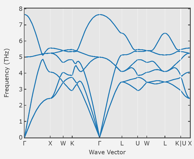 $$\vec{u}_{lmn}^j = \vec{u}_{\vec{k}}^j\exp\left(i\left(l\vec{k}\cdot\vec{a}_1+m\vec{k}\cdot\vec{a}_2+n\vec{k}\cdot\vec{a}_3-\omega t\right)\right).$$Here $j = 1,2,\cdots,p$ is an index that runs over the atoms in the basis. Inserting these solutions into the differential equations results in an eigenvalue problem that can be solved for $3p$ normal mode frequencies and $3p$ normal modes for each value of $\vec{k}$. Three of the normal modes are acoustic modes where $\omega \rightarrow 0$ as $|\vec{k}| \rightarrow 0$. The other $3p-3$ modes are optical modes where the normal mode frequencies are in the infrared for all values of $\vec{k}$.
