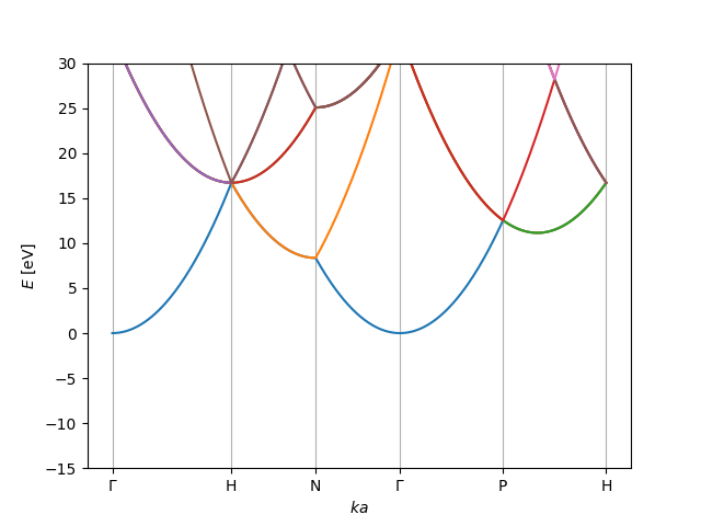 This animation shows how the band structure changes as the amplitude of the periodic potential grows. The potential is a 3-D comb with large amplitude negative peaks at the bcc Bravais lattice points. The amplitude of all of the Fourier coefficients $U_G$ are the same. For $U_G = 0$, the band structure is the same as for the empty lattice approximation. As the amplitude of the potential increases, the lowest band splits off and the upper bands reconfigure so that they take nearly the form of the empty lattice approximation again.
