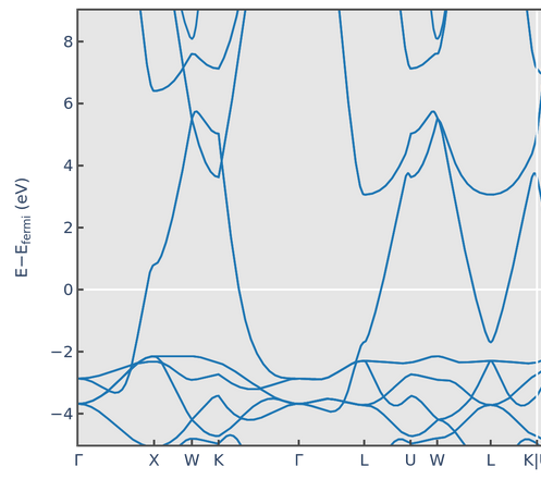 Copper has an electron configuration of 3d104s1. The 3d bands are filled and are those below -2 eV in the DFT calculation. The 4s electron half fills the next band (orange in the plane wave plot). The plane wave method models the dispersion reasonably well above the 3d bands.