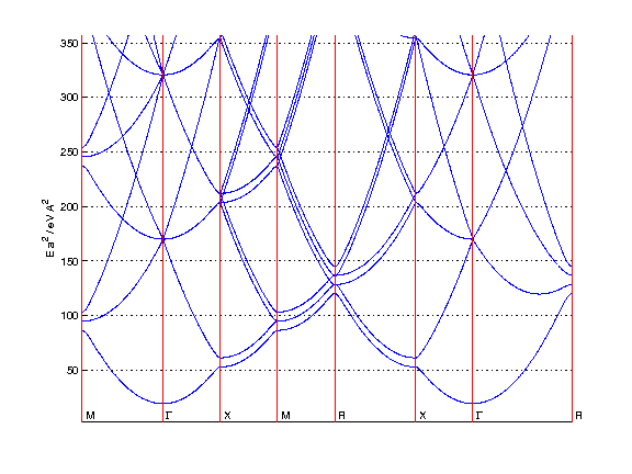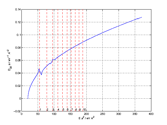 The dispersion relation and the density of states for a simple cubic crystal are plotted below. The amplitude $V$ of the periodic potential can be adjusted with a slider. At $V=0$, the dispersion relation is the empty lattice approximation, and the density of states increases like the square root of the energy. As $V$ increases, the dispersion curve strikes the Brillouin zone boundaries at 90° and the density of states develops some structure. For large values of $V$, band gaps appear in the dispersion relation, and the density of states goes to zero for some range of energies.
